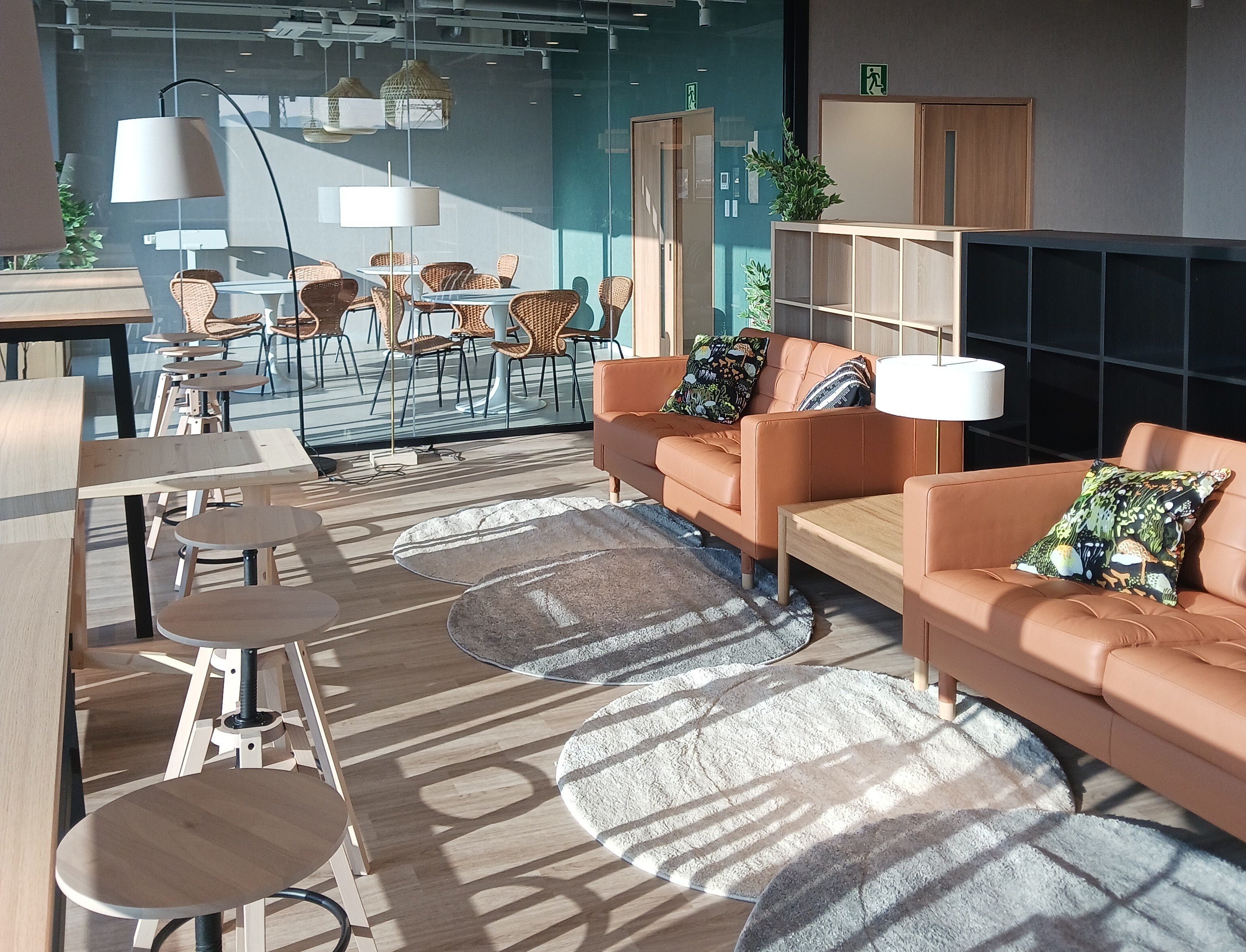 社員がリフレッシュや打合せに利用するサードプレイスです。素材感溢れる柔らかな色合いとデザインを採用し、自然に息を抜き、自由なアイデアを生み出すことを促します。社内イベントや多様な形式の会議にも対応し、部門を超えた偶発的な交流を促す場となります。