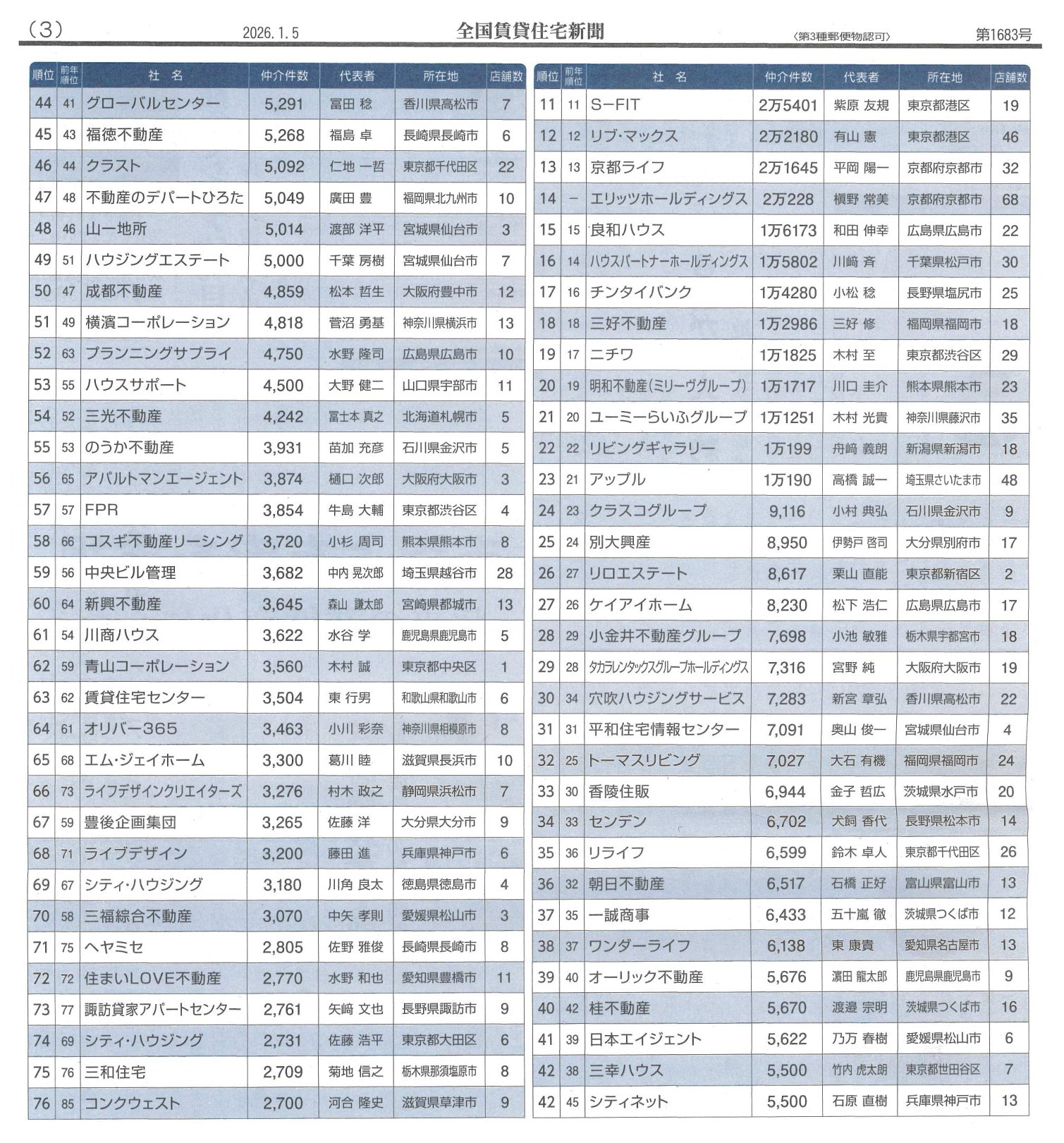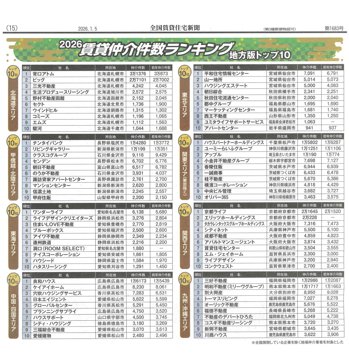 この度、2026年1月5日発行の『全国賃貸住宅新聞』において発表された「2026年賃貸仲介件数ランキング」にランクインいたしました。
