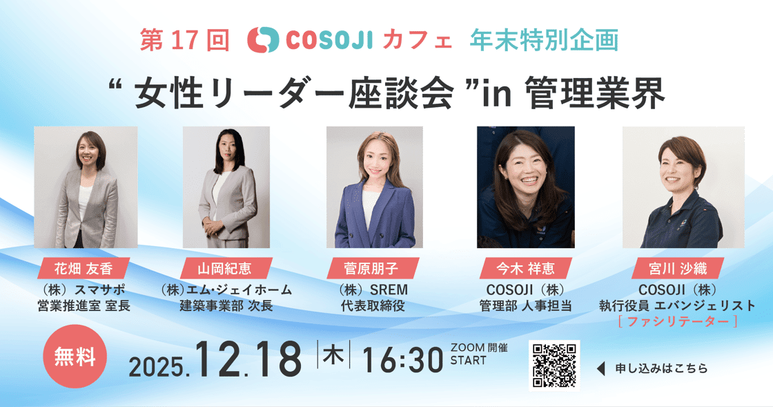 当社の建築事業部 次長 山岡が、株式会社COSOJI主催のオンラインイベント「第17回COSOJIカフェ 年末特別企画 “女性リーダー座談会” in 管理業界」にパネリストとして登壇いたしました。