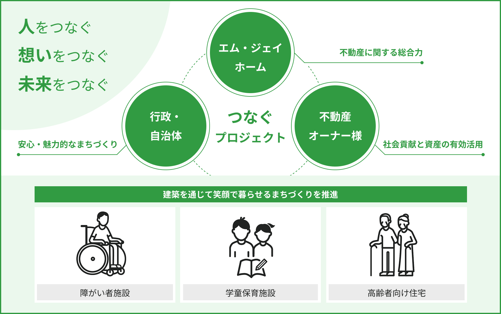 当社の持ち味である不動産の総合力を活かし、福祉施設を必要とする人と、不動産を有効活用したいオーナー様を「つなぐ」ことで、社会貢献と資産活用の両立を実現いたします。