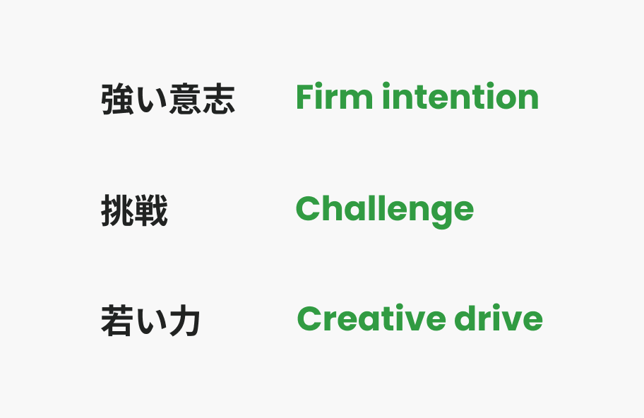 ブランドバリューには「強い意志」、「挑戦」、「若い力」という3つのキーワードを掲げ、各キーワードにはメッセージが3つずつ含まれる形で、より具体的な内容を示しています。