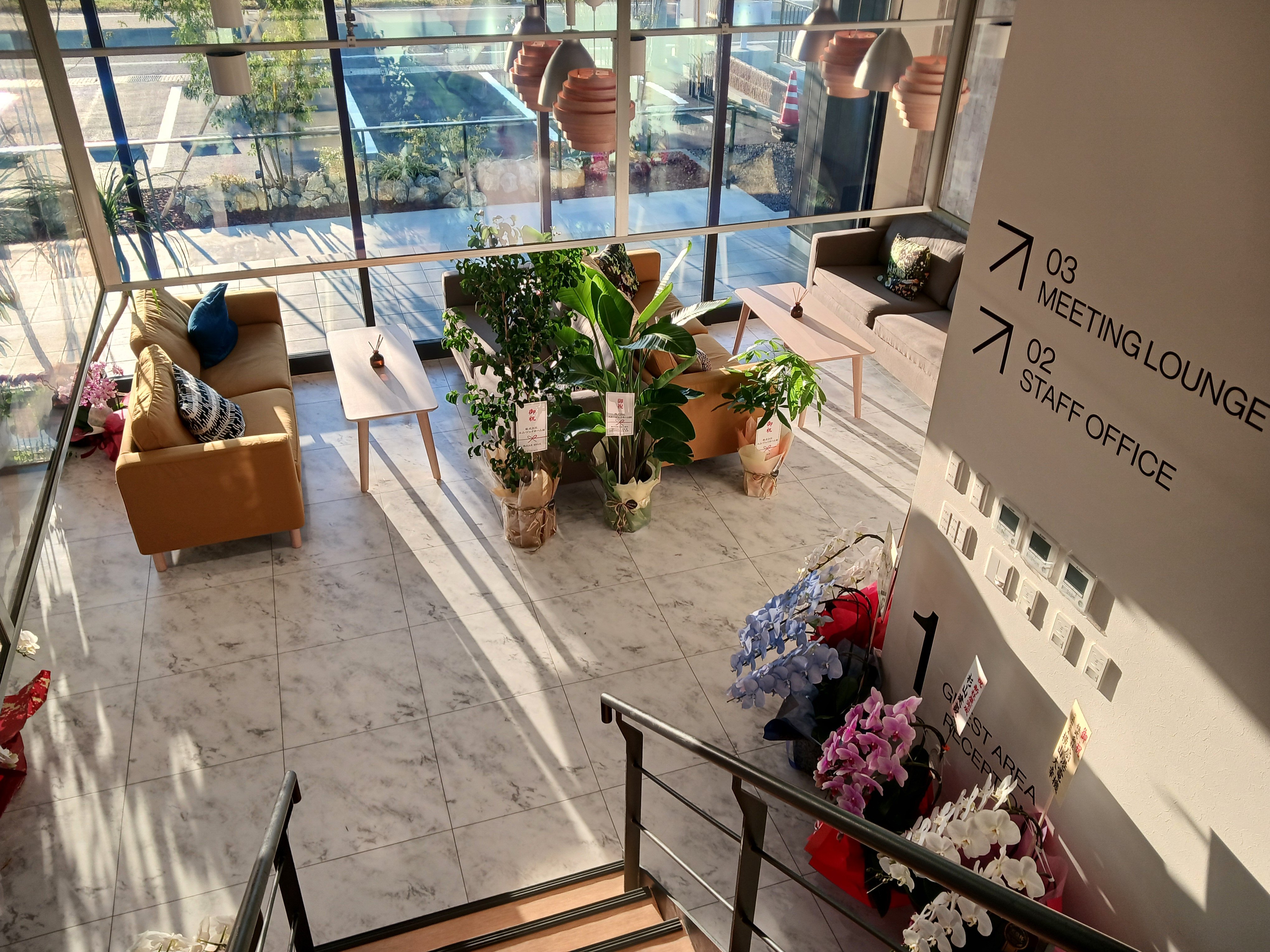 白を基調とした洗練されたシャープな印象の空間に、豊富なグリーン(植物)を配置し、柔らかな調和を生み出しています。訪れる皆様を穏やかな雰囲気でお迎えし、当社の新しい顔として、ブランドイメージを体現します。