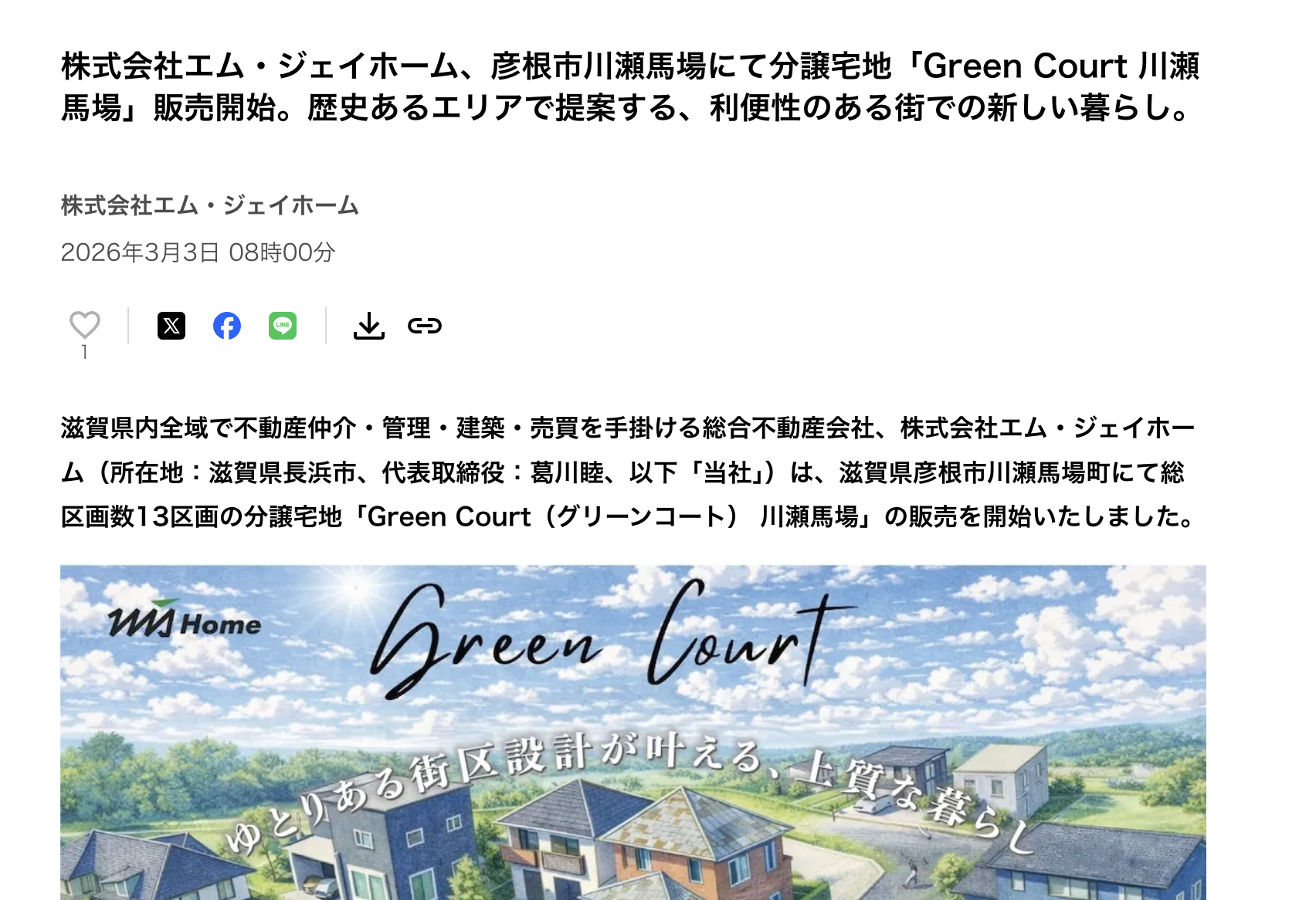 株式会社エム・ジェイホーム、彦根市川瀬馬場にて分譲宅地「グリーンコート川瀬馬場」販売開始。歴史あるエリアで提案する、利便性のある街での新しい暮らし。